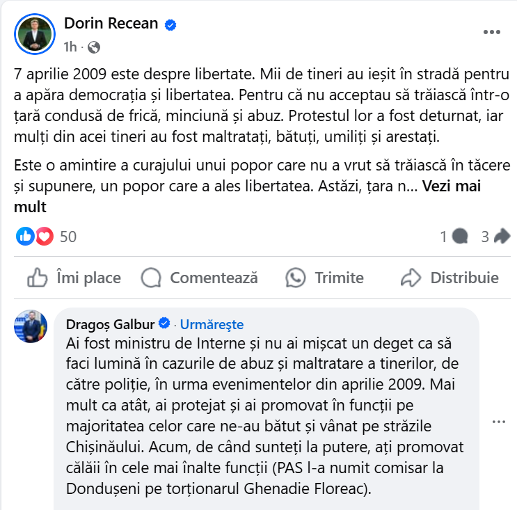 După ce Recean a scris că „7 aprilie 2009 este despre libertate” și „o amintire a curajului unui popor care nu a vrut să trăiască în tăcere și supunere”, Galbur i-a comentat postarea aducându-i aminte actualului premier că, din postura sa de șef la Interne „nu ai mișcat un deget ca să faci lumină în cazurile de abuz și maltratare a tinerilor, de către poliție, în urma evenimentelor din aprilie 2009”.