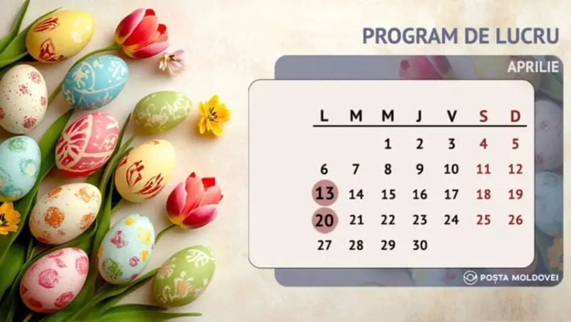 Poșta Moldovei anunță programul de lucru în perioada sărbătorilor pascale. Potrivit unui comunicat, 13 și 20 aprilie vor fi zile libere pentru toate oficiile și agențiile poștale ale întreprinderii.